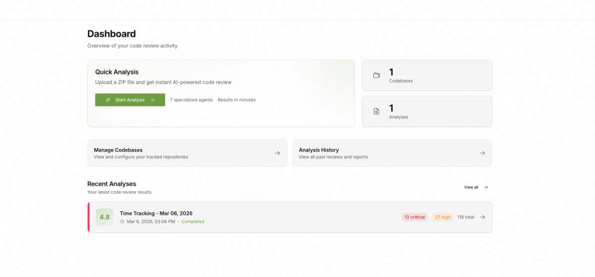 Our AI Code Analysis platform delivers the depth of a senior engineer’s audit in minutes, analysing architecture, security, code quality, and technical debt to provide a clear view of your software.